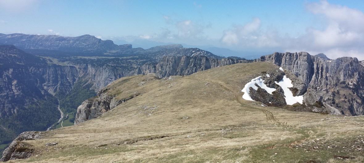 Usciamo sulla vetta finalmente alla luce calda del sole e la sorpresa è grande… all’entusiasmo della salita fatta si aggiunge quella per la forma caratteristica del monte: un pianoro larghissimo che piomba verticalmente da tutti i lati ci si affacci. Un ometto di pietre ci proietta su uno sfondo di montagne e paesaggi d’intorno di grande respiro… vale la fatica fatta e il freddo patito!