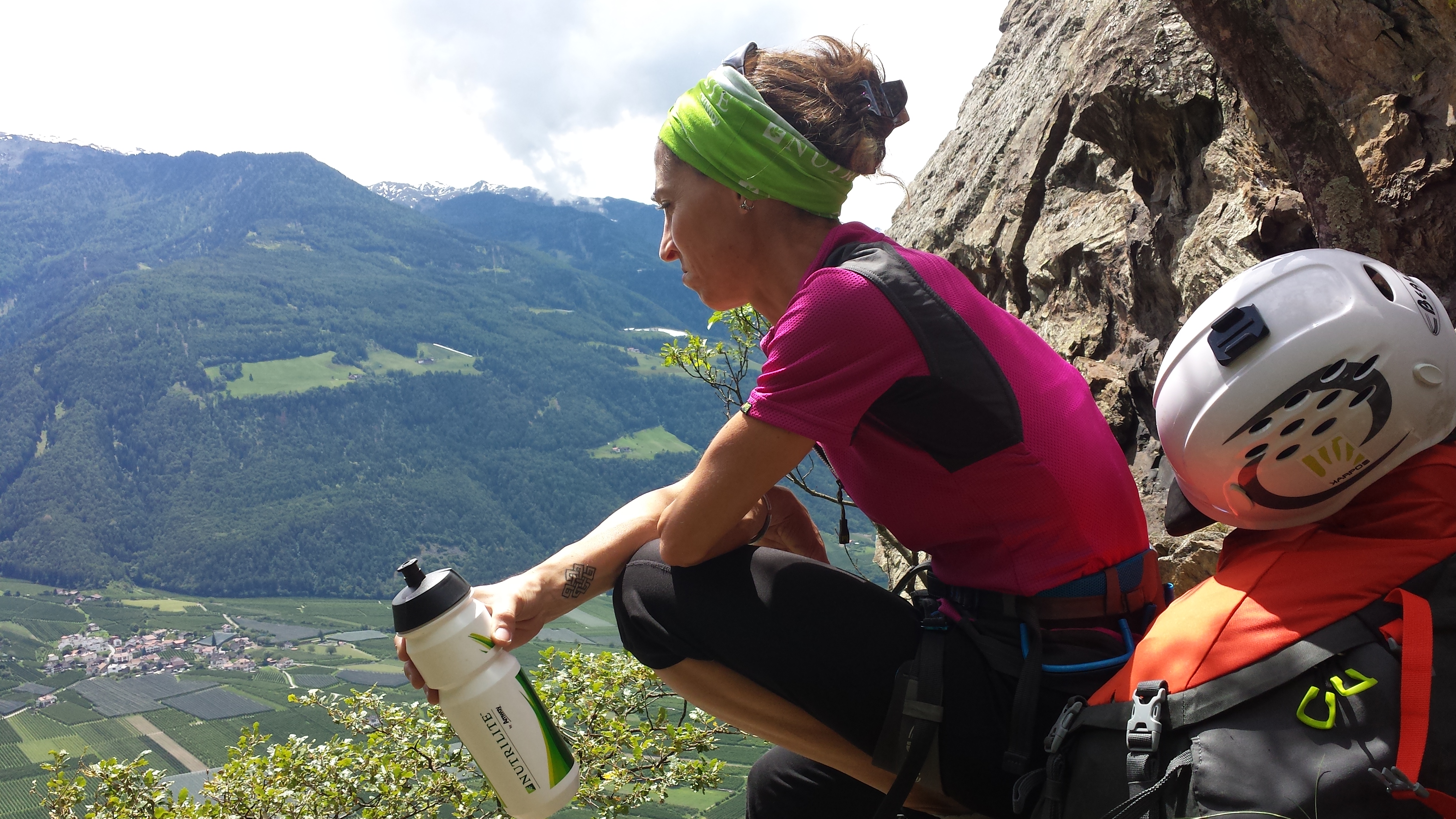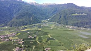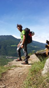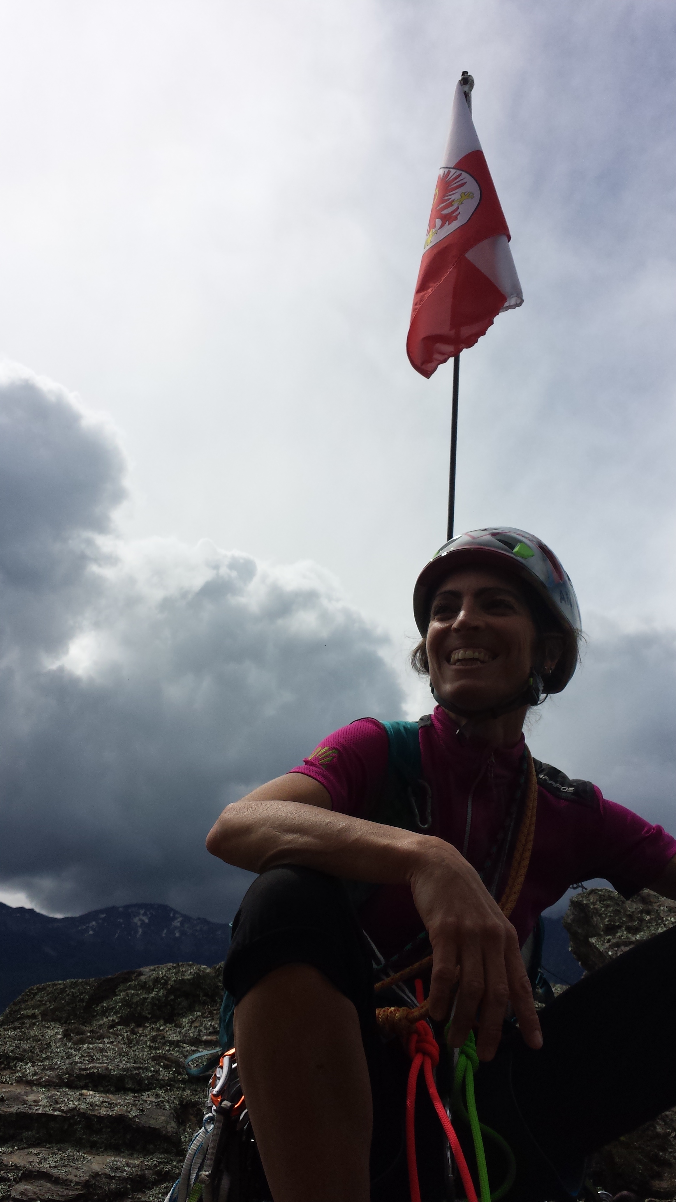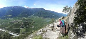 Gian sale veloce e in breve siamo su… la bandiera del Sud Tirolo sventola e accanto ci mettiamo quella del Nepal.Le campanelle delle capre le sentiamo lontane. Attorno il panorama è davvero stupendo: meleti a perdita d’occhio tirati così dritti che sembrano disegnati, il verde chiaro dell’erba umida, il blu del cielo e delle nuvole che corrono, il castello Juval imponente e maestoso e noi… noi più alti con attorno rumori e silenzio. Nulla di che come torre, ma col sapore dell’avventura e della scoperta e il piacere di essere soli quassù senza nemmeno averci sperato. Un pizzico di fortuna ci ha aiutati, l’andare sempre col naso all’insù ce l’ha fatta notare e la voglia di andare a curiosare ci ha permesso una salita di tutta soddisfazione.