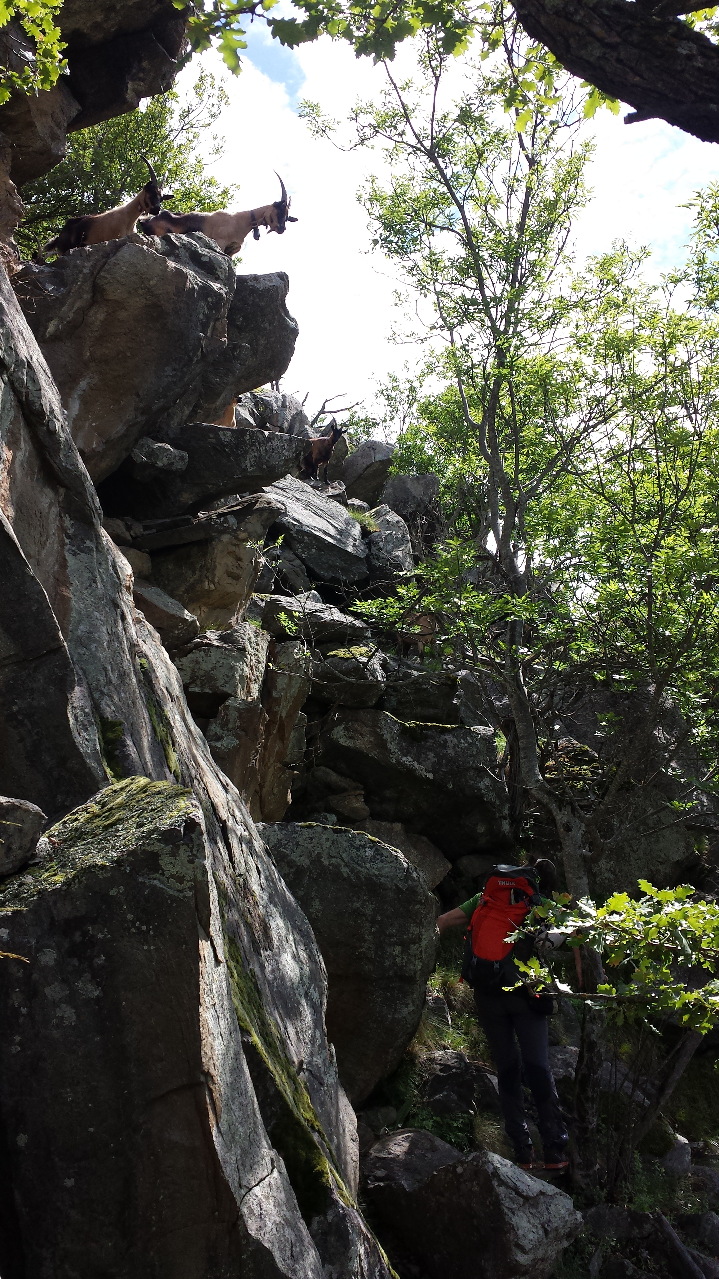 Piccolo problema: guardando da giù non si vede nessun sentiero, relazioni quasi non ce ne sono, e quello che credevamo l’accesso giusto, visto da giù in realtà non dava molto l’idea di un percorso percorribile. Decidiamo di salire lungo i tralicci per un sentiero da capre in mezzo alle pietraie e ai boschi. Un gruppo di capre ci tiene d’occhio e scalpita quando ci vede salire invadendo il loro territorio. Volevamo l’alpinismo di scoperta? Voilà… eccolo!