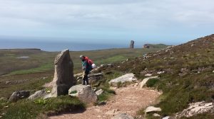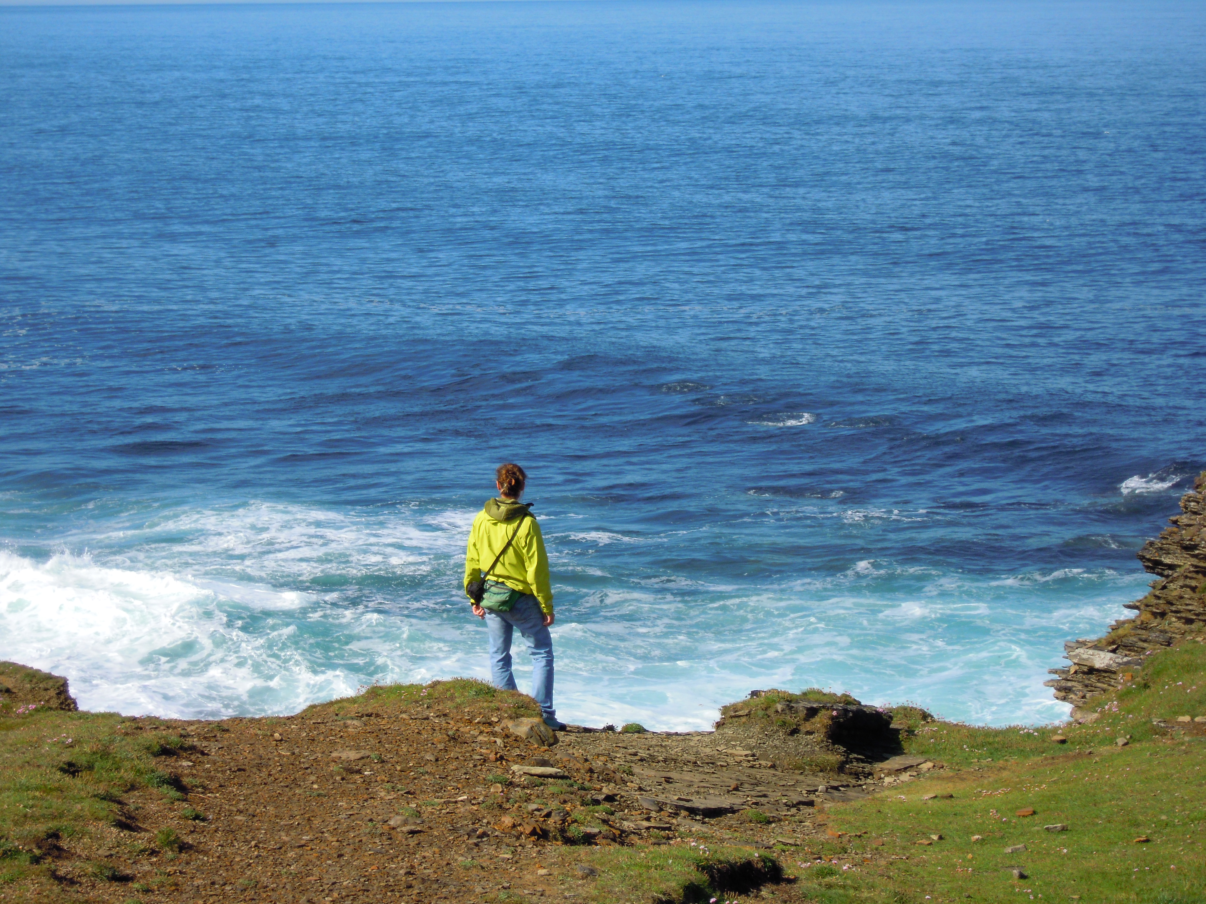 Sistemati nell’ostello, non prima del gioco a nascondino della chiave che ci ha accompagnati ostello per ostello, abbiamo deciso di andare a curiosare la torre. Il sentiero verso The Old Man of Hoy parte da una baia bellissima, dove il mare si infrange su scogliere alte e spaccate rompendosi in mille goccioline che il vento disperde con effetto quasi magico. Per esser sicuri di non sbagliare ci mettiamo tutta la ferraglia addosso dopo uno sguardo e un “…pensi anche tu quello che penso io?????”