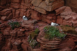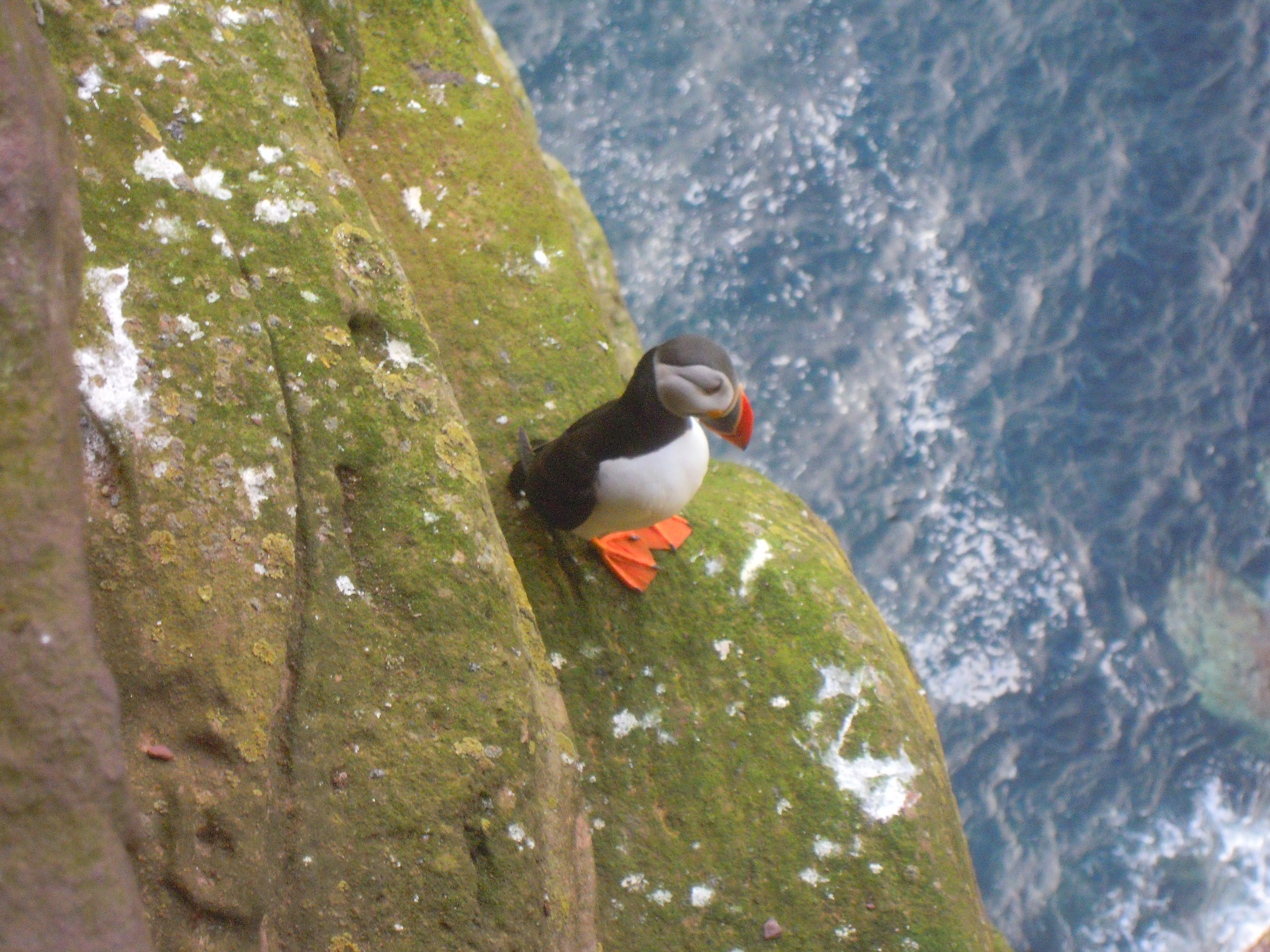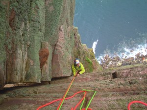 Ci vestiamo velocemente e attacchiamo. Arrampicata dura, dove la roccia, di una consistenza e una granulosità particolari, è resa scivolosa da salsedine, sabbia, guano di gabbiani e alghette. Nella via non ci sono quasi protezioni..si sale trad col mare che mugghia sotto di noi e il vento che ci spazza. Il secondo tiro, quello chiave, è infinito. Gian sparisce dietro un diedro e con lui sparisce anche la possibilità di comunicare. La corda non scorre, non ci sentiamo anche urlando e il tempo scorre lento senza che niente accada…minuti su minuti mentre inizio a non sentire più mani e piedi e iniziano a cadere le prime gocce di pioggia. Pensando al peggio provo lentamente a recuperare la corda e dopo un tempo infinito parto incontrando uno dei tiri più affascinanti e al tempo stesso assurdi di tutta la mia corta carriera arrampicatoria. Il vento mi turbina attorno portando sabbia e salsedine negli occhi, attorno vedo le prime puffin che ci tengono d’occhio e sento le urla dei gabbiani incavolati per aver violato noi il loro territorio di cova. Ha iniziato a piovere bene..ma dopo esserci consultati e aver avuto la tentazione di calarci, decidiamo di resistere e aspettare alcuni minuti. La nostra caparbietà verrà ripagata da un’occhiata di sole che ci permette di continuare la salita.