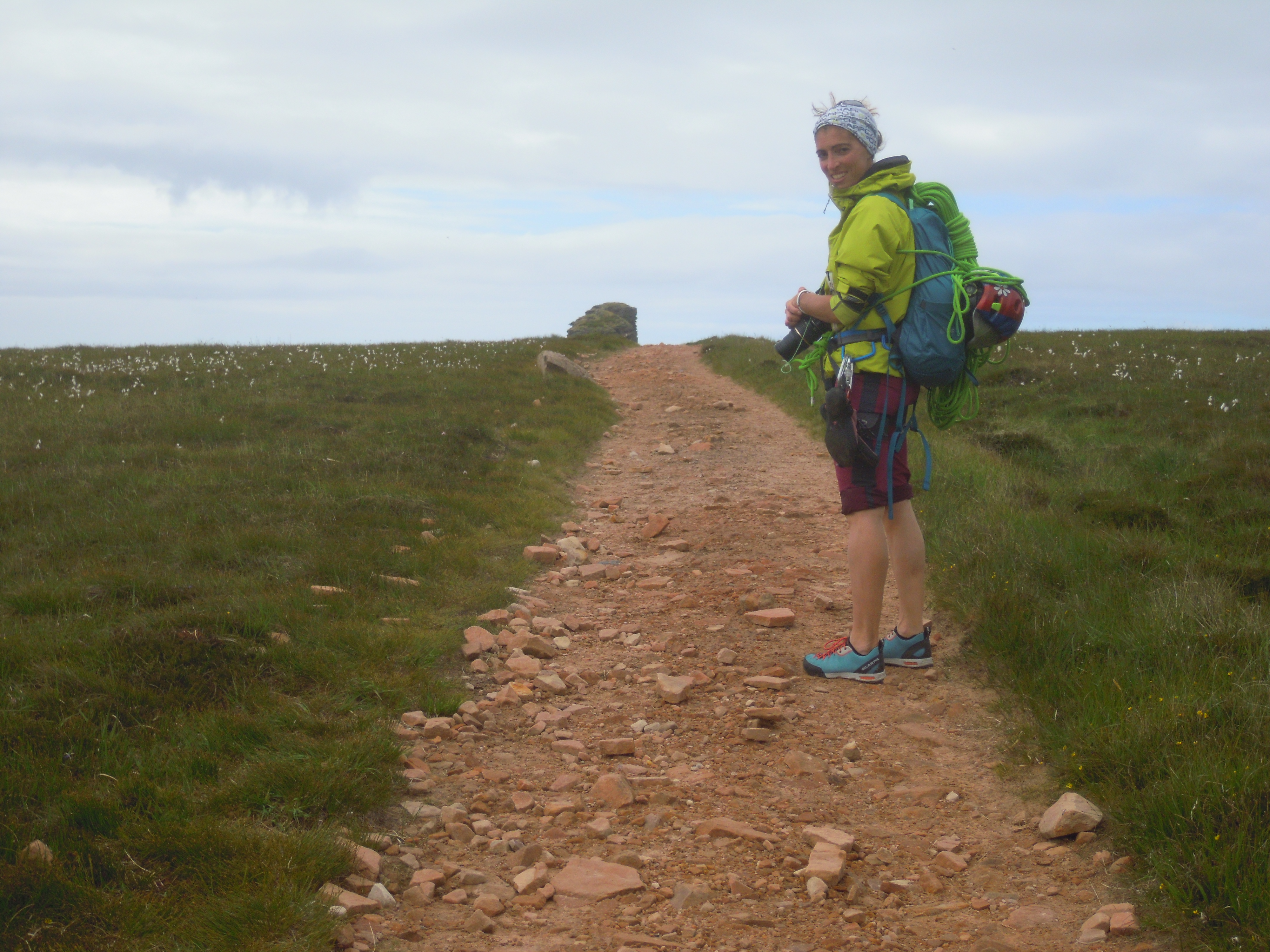 Il sentiero si snoda lungo la scogliera in alto sul mare, attorno solo prati ed eriche e..lontano, lontano ecco apparire..la “nostra” sognata torre: bella, magica, imponente.. ci avviciniamo trattenendo il fiato mentre ne osserviamo la bellezza senza bisogno di parole…lo so…stiamo pensando ancora una volta la stessa cosa: quanto siamo piccoli qui davanti e lei! Il tempo si sta annuvolando, ma non pare proprio brutto..e quindi decidiamo di tentare la sorte. L’avvicinamento verso la partenza è insidioso per un sentierino da capre (evidentemente le capre sono il fil rouge delle nostre salite!ehehe) che ci deposita alla base della torre nel cono di detriti viscidi di alghe e salsedine che dividono la terraferma dalla torre e che con l’alta marea si coprono.
