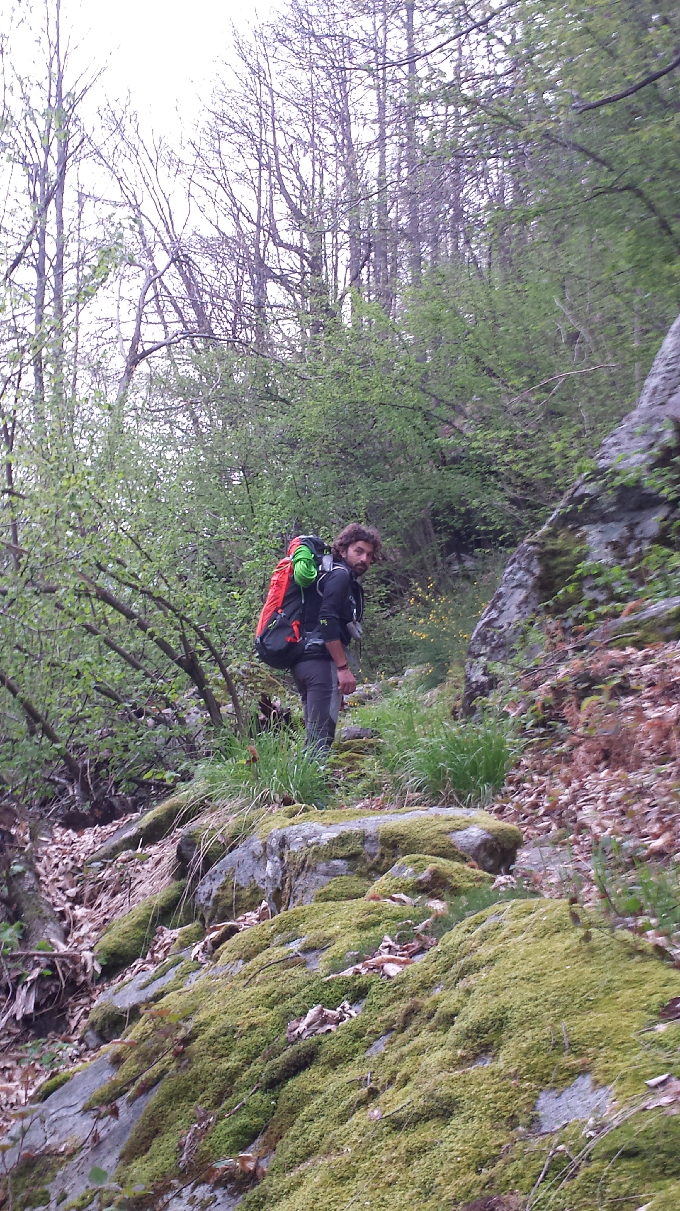 La mattina mentre il caffè diffonde un profumino di casa attorno, facciamo colazione mentre cominciano a cadere le prime gocce di pioggia. Cielo plumbeo, chiuso ovunque, ma si sale lo stesso su per un sentiero muschioso e invaso da felci e infestanti tra l’odore della terra bagnata e di fiori primaverili. La voglia di salire c’è, siamo emozionati mentre vestiamo orgogliosi l’abbigliamento, le scarpe, gli zaini e l’attrezzatura di chi ha creduto in noi. La torre è sopra di noi e diventa maestosa ogni passo che facciamo..ci ripariamo sotto un enorme tetto di roccia preparandoci a una lunga attesa fatta di ore di freddo, umido e voglia di ritornare nel sacco a pelo.