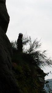 Poi verso le 12 decidiamo di acchiappare una breve schiarita e tentare un tiro “così…giusto per vedere com’è la roccia e quanto tengano le scarpette sul serpentino bagnato!”